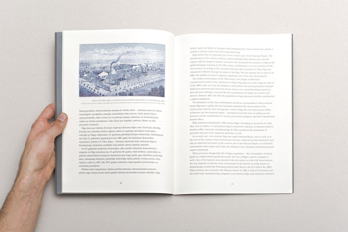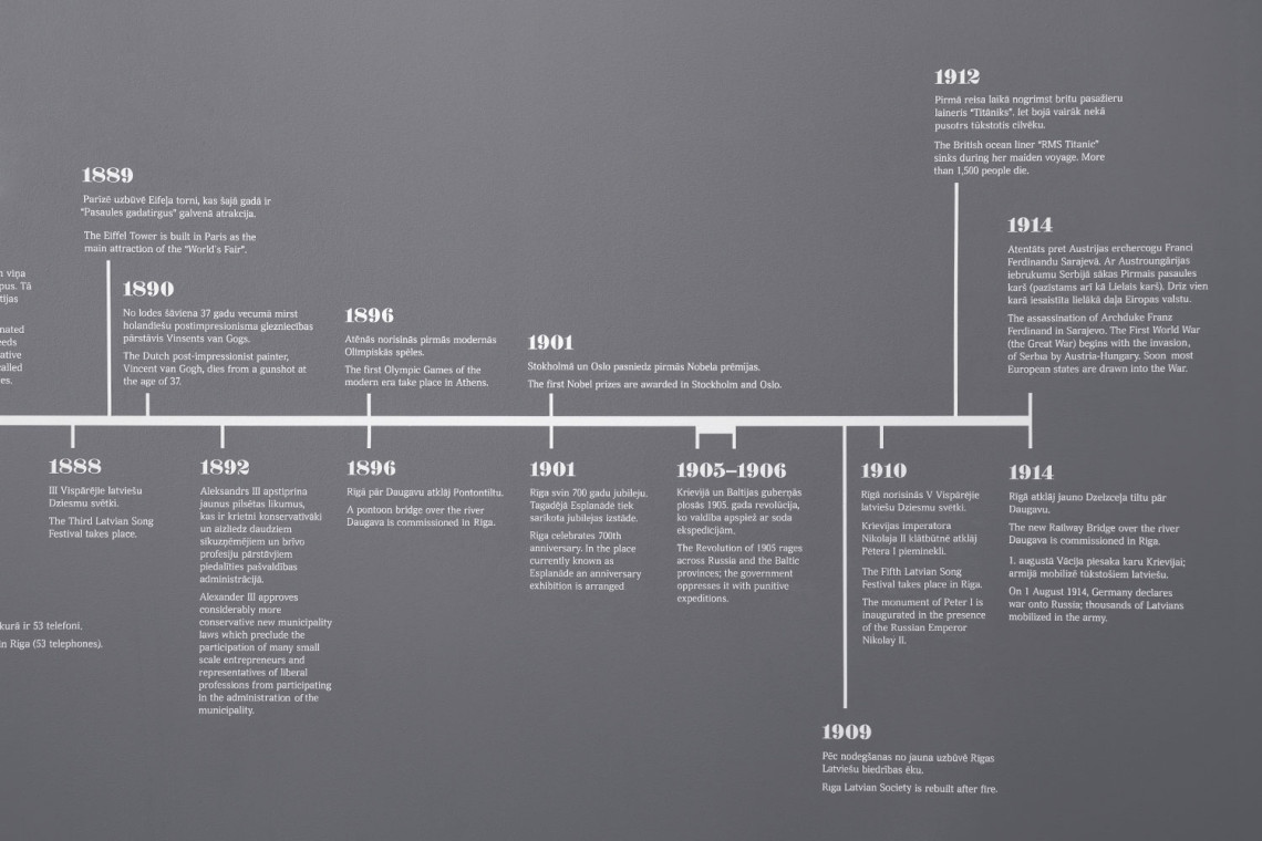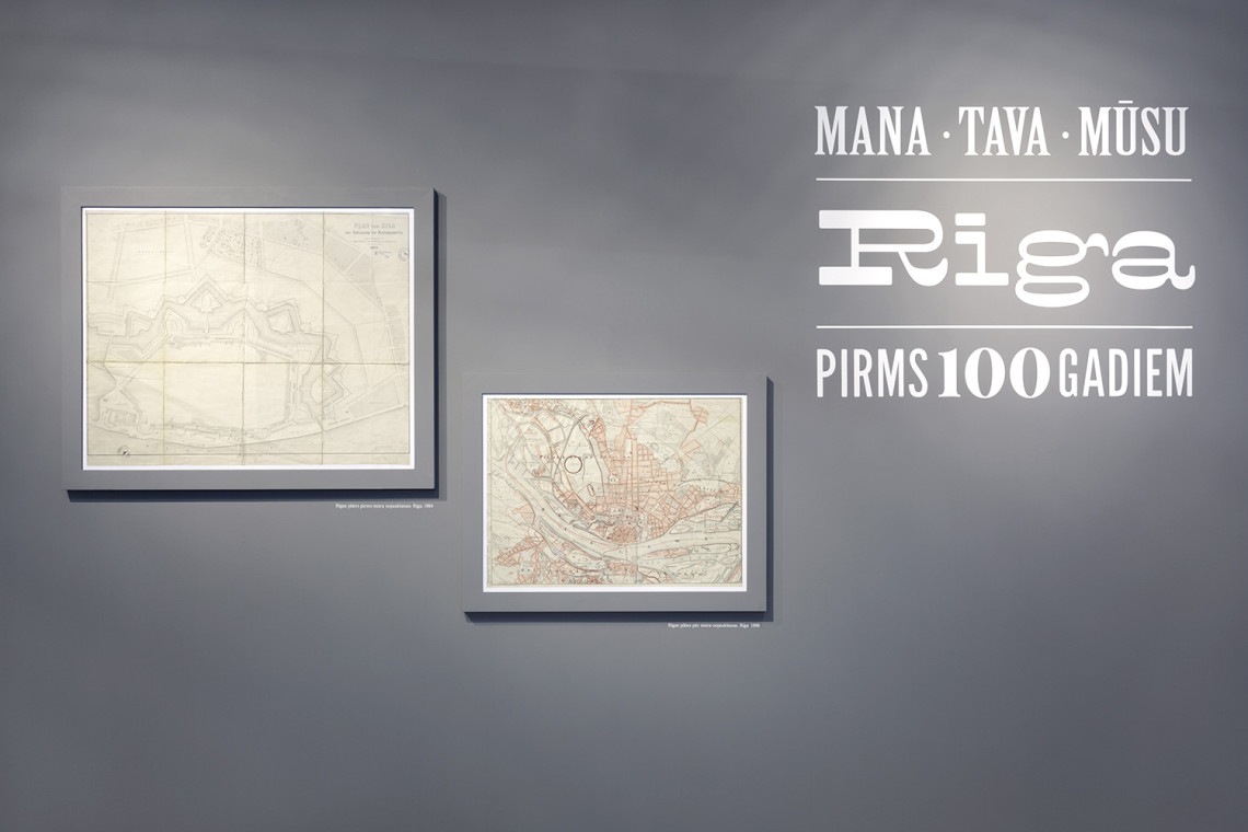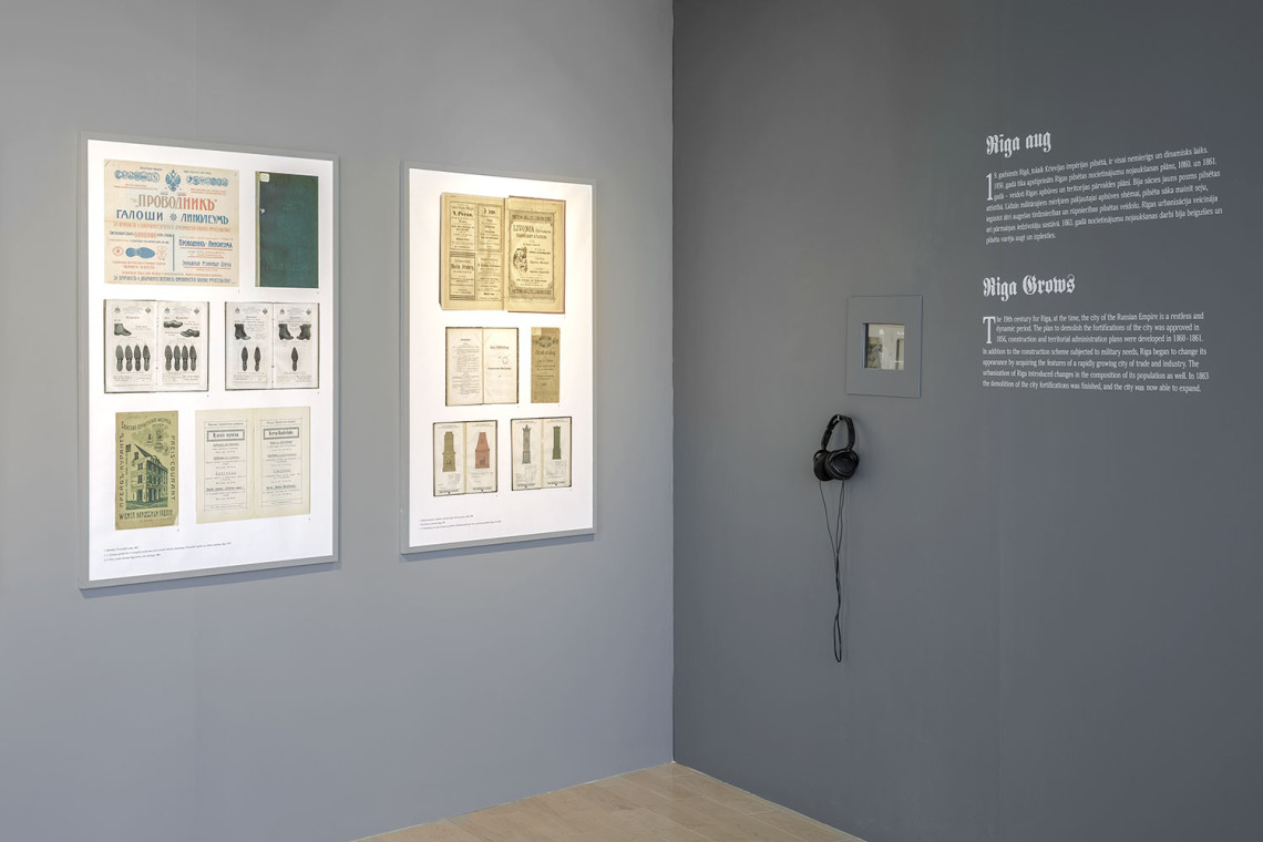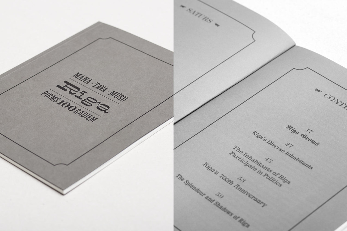 Visual identity and graphical material development for an exhibition about Riga between the middle of the 19th century and World War I — a period during which medieval fortifications were taken down and the city expanded rapidly. Creation of an eclectic logotype reminiscent of period advertisements which featured a great many different typefaces.