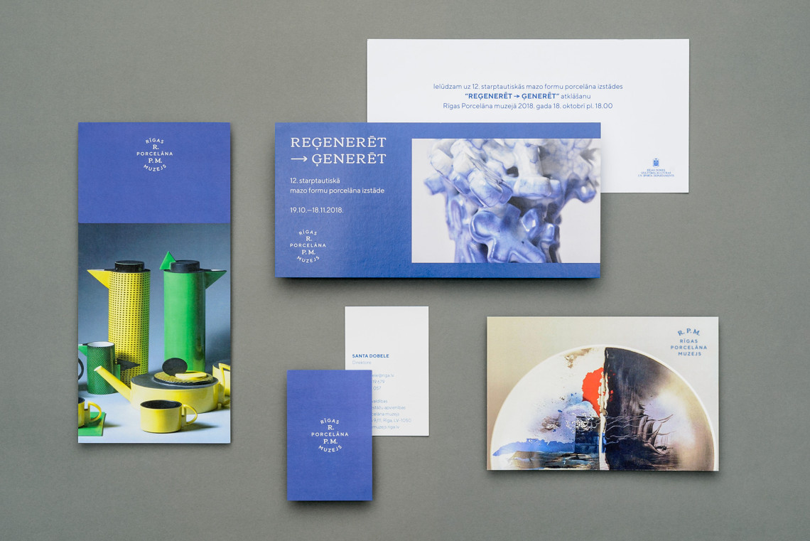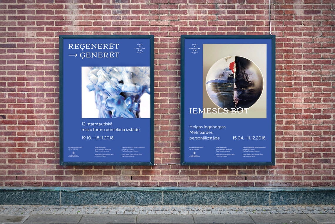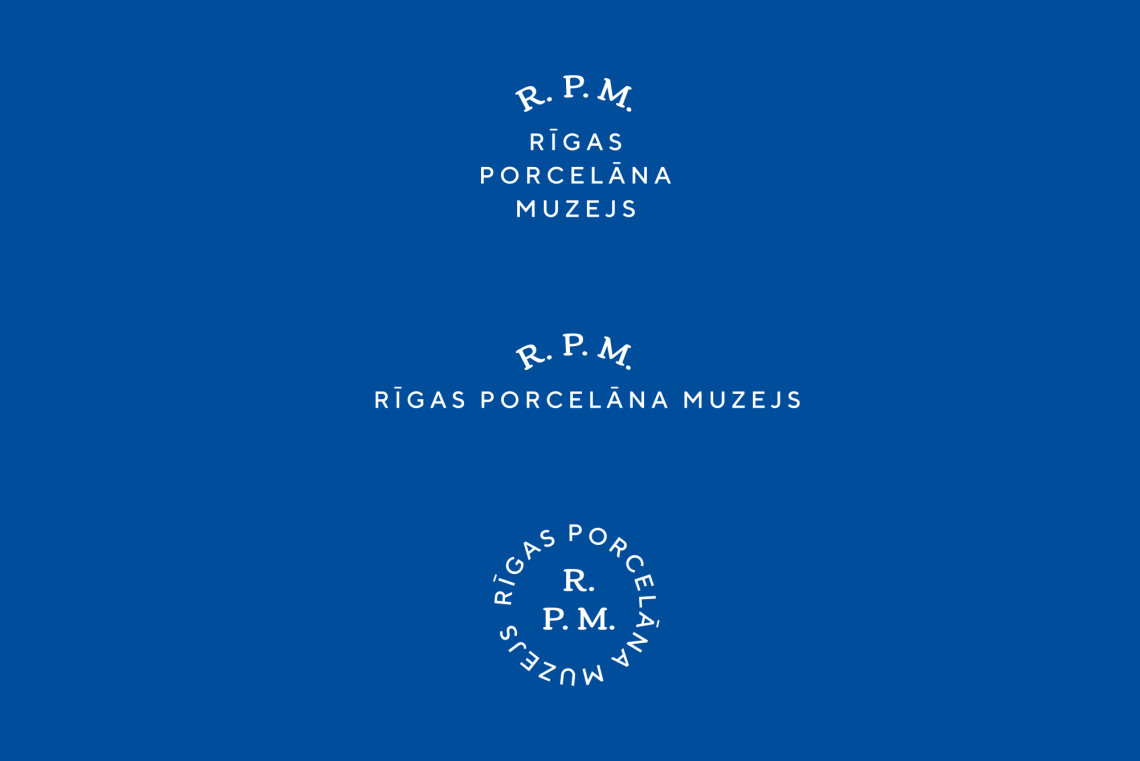 Visual identity redesign for the Riga Porcelain museum. Identity consists of a few logo variations which are used contextually. It echoes with time when various marks were used on the products of a particular manufacturer to inform about quality, technique used etc. White (porcelain) and blue (cobalt) are deeply rooted in the history of porcelain looking back as far as 7-10th century China where the technique using cobalt on porcelain was perfected and used widely.